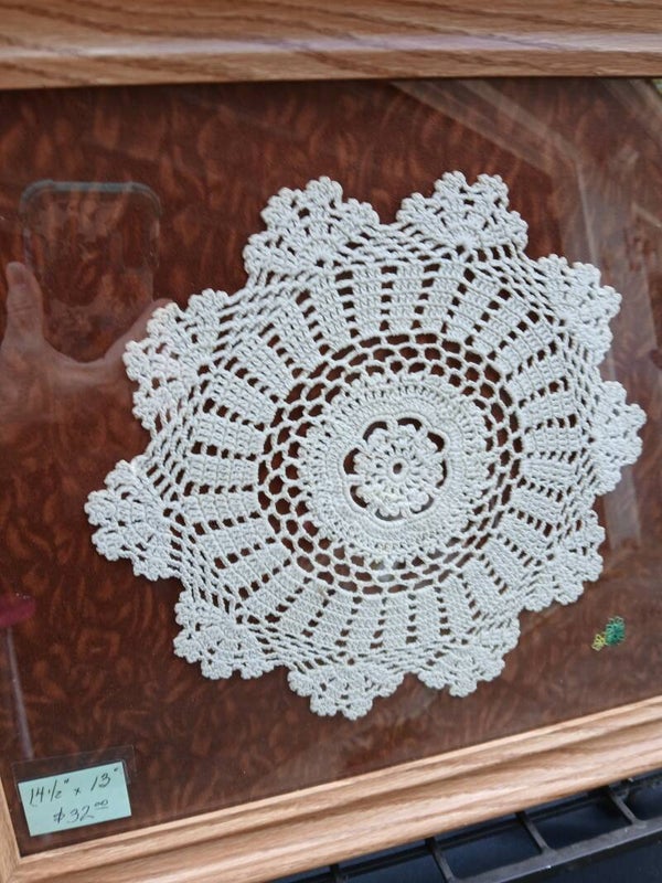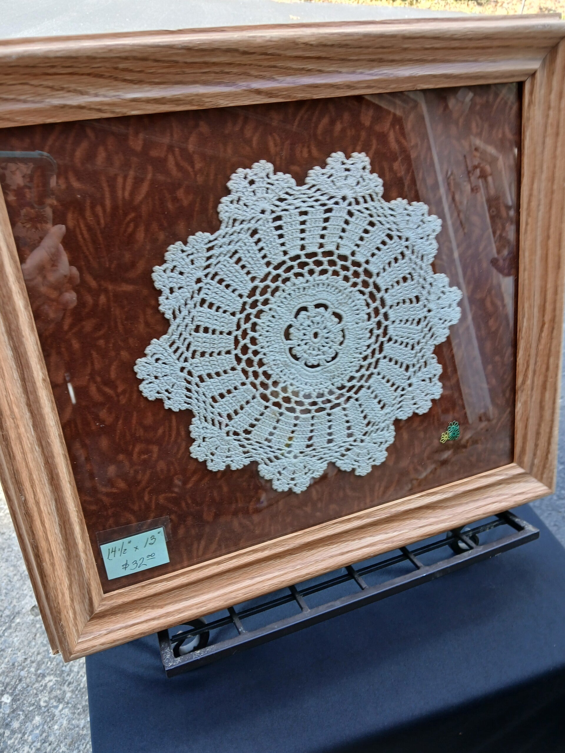 Beautiful off-white vintage doily framed under glass with shades of rust background. This fabric art measures 14 1/2" x 13." Continental US shipping only.